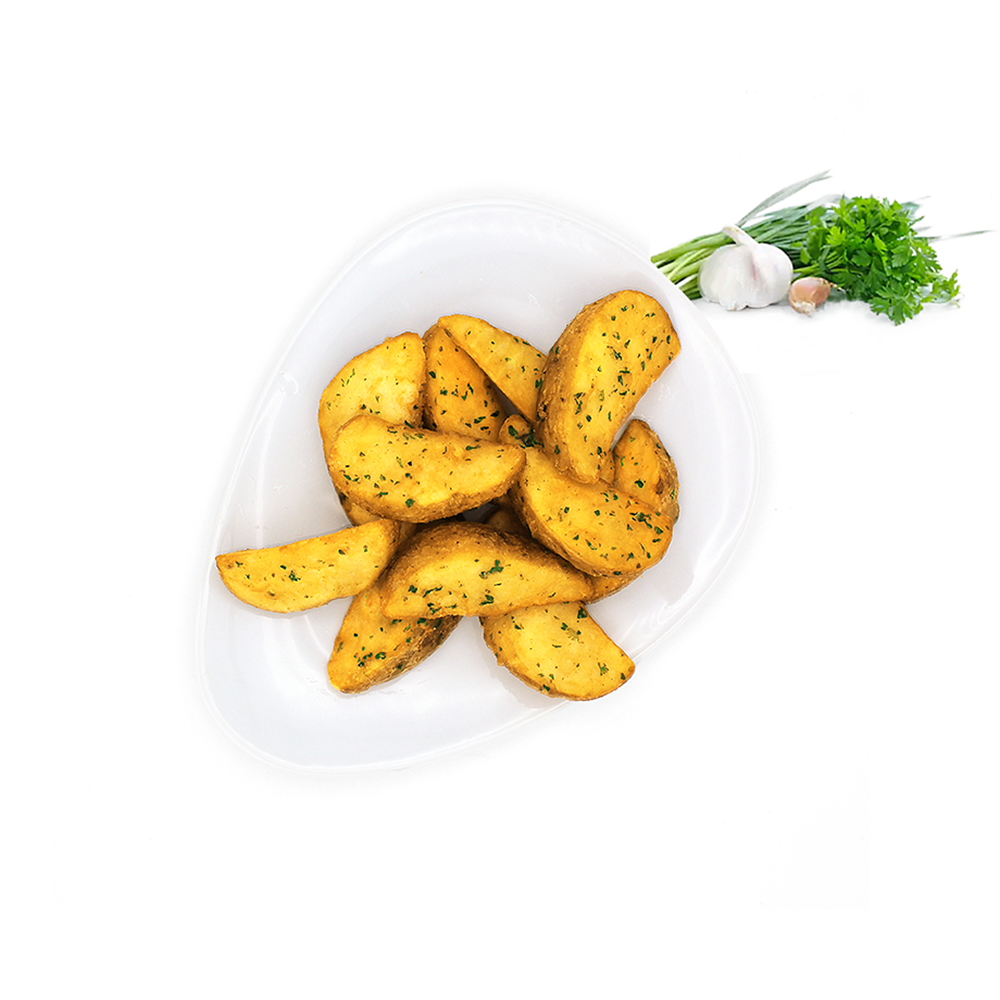 Délicieux quartiers de pomme de terre avec peau, enrobés d’une préparation à l’ail et aux fines herbes. D’aspect rustique, ils apportent cette petite pointe de goût à votre plat.